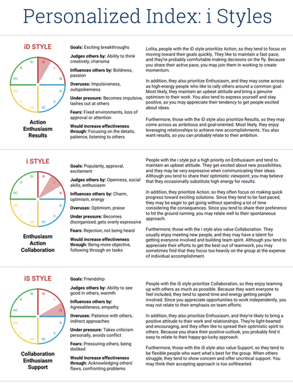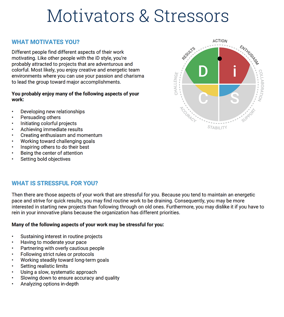 Ce questionnaire s'appuie sur le modèle DiSC , qui décrit nos préférences de comportement au travail . Il aide à comprendre comment nous avons tendance à agir face aux objectifs, aux relations, au rythme et aux règles, afin de mieux collaborer et communiquer selon les situations. D'après mes résultats, je me situe principalement dans un style iD (Influence + Dominance). Concrètement, j'ai tendance à mobiliser les autres grâce à une communication directe et engageante, à rechercher un rythme d'action élevé et à rester très orientée résultats . J'aime faire avancer les projets, fédérer autour d'une vision et obtenir des décisions claires, tout en gardant une dimension relationnelle forte.